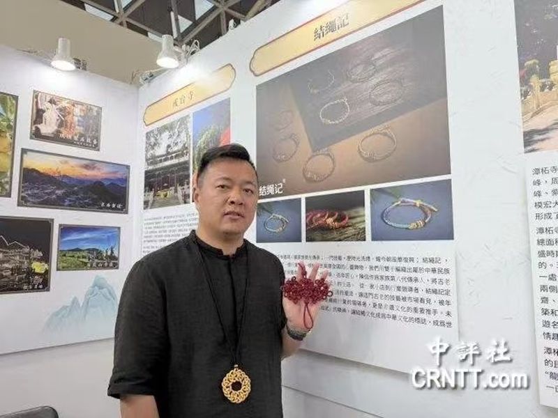 近日,北京門頭溝區旅游行業協會受邀赴臺灣參加“2025高雄市旅行公會國際旅展”。除推介門頭溝區風景、文創外,“結繩技藝”非遺傳承人陳信也到場交流,分享如何將古法編織工藝做創新,“結”如何成為文化載體,編出代表健康的藥師結、追求好運的桃花繩以及端午應景的平安繩等,受到來參展的年輕朋友的喜愛。