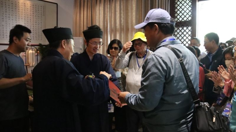 “摸石猴”“打金錢眼”“拜太歲”……白云觀內還有許多民俗活動,參訪團成員們積極參與其中,體驗傳統道教文化的魅力。值得一提的是,觀內工作人員特別為大家準備了手寫“福”字,“福”文化歷史悠久,與中華民族同生,是維系各民族情感、團結各階層、推動中華民族不斷發展前行的最強有力的文化紐帶,大家手持“福”字、面露笑容,展現了京臺兩地人民對“福”的共同追求。